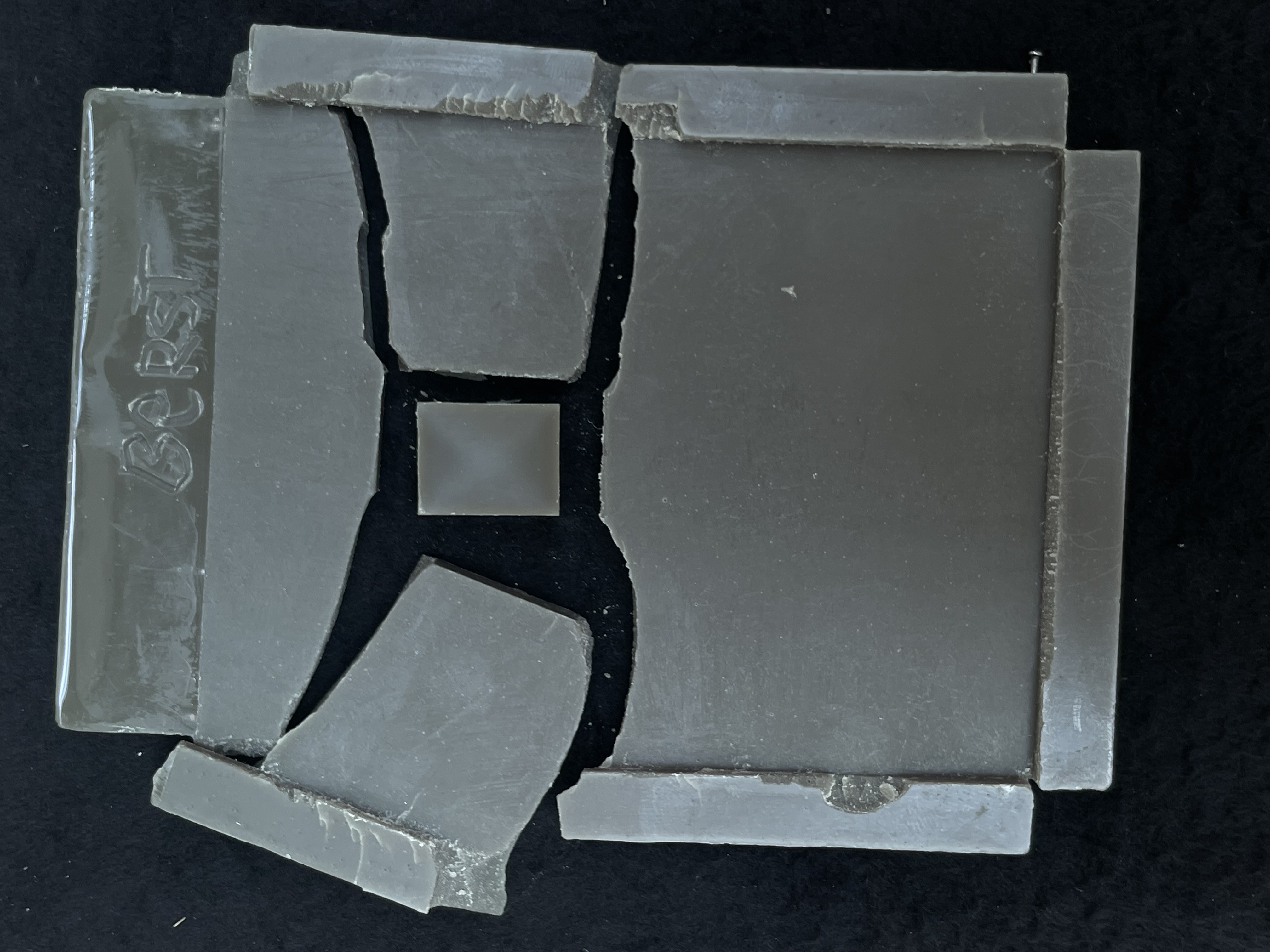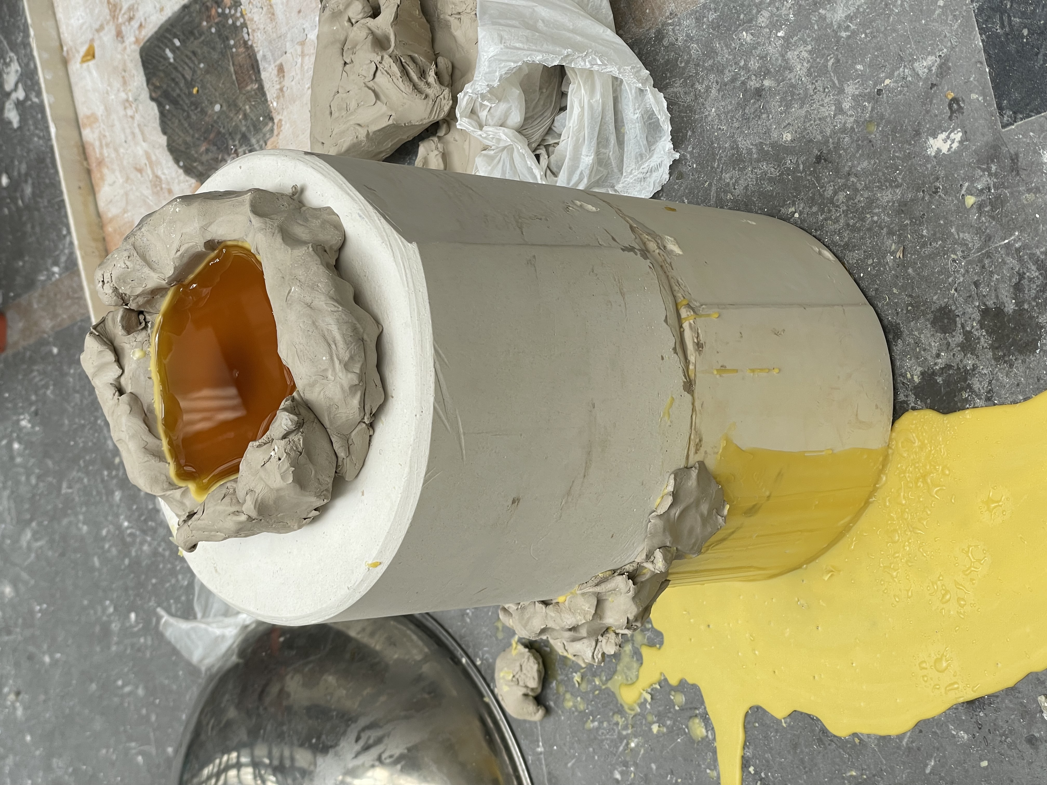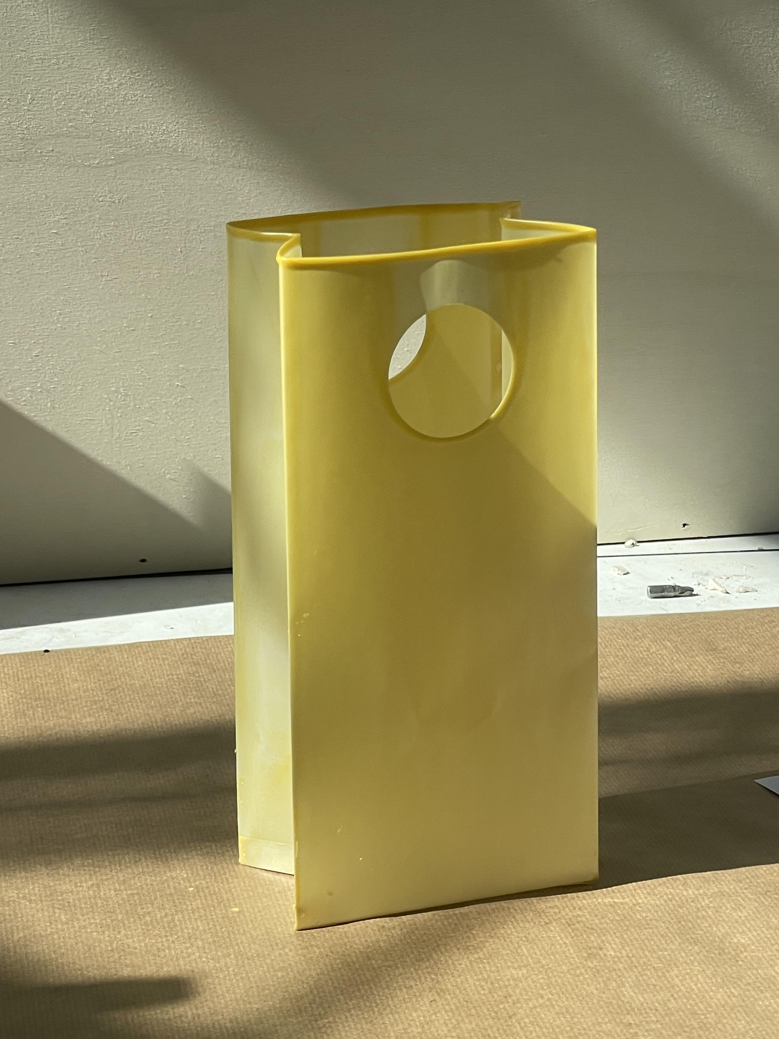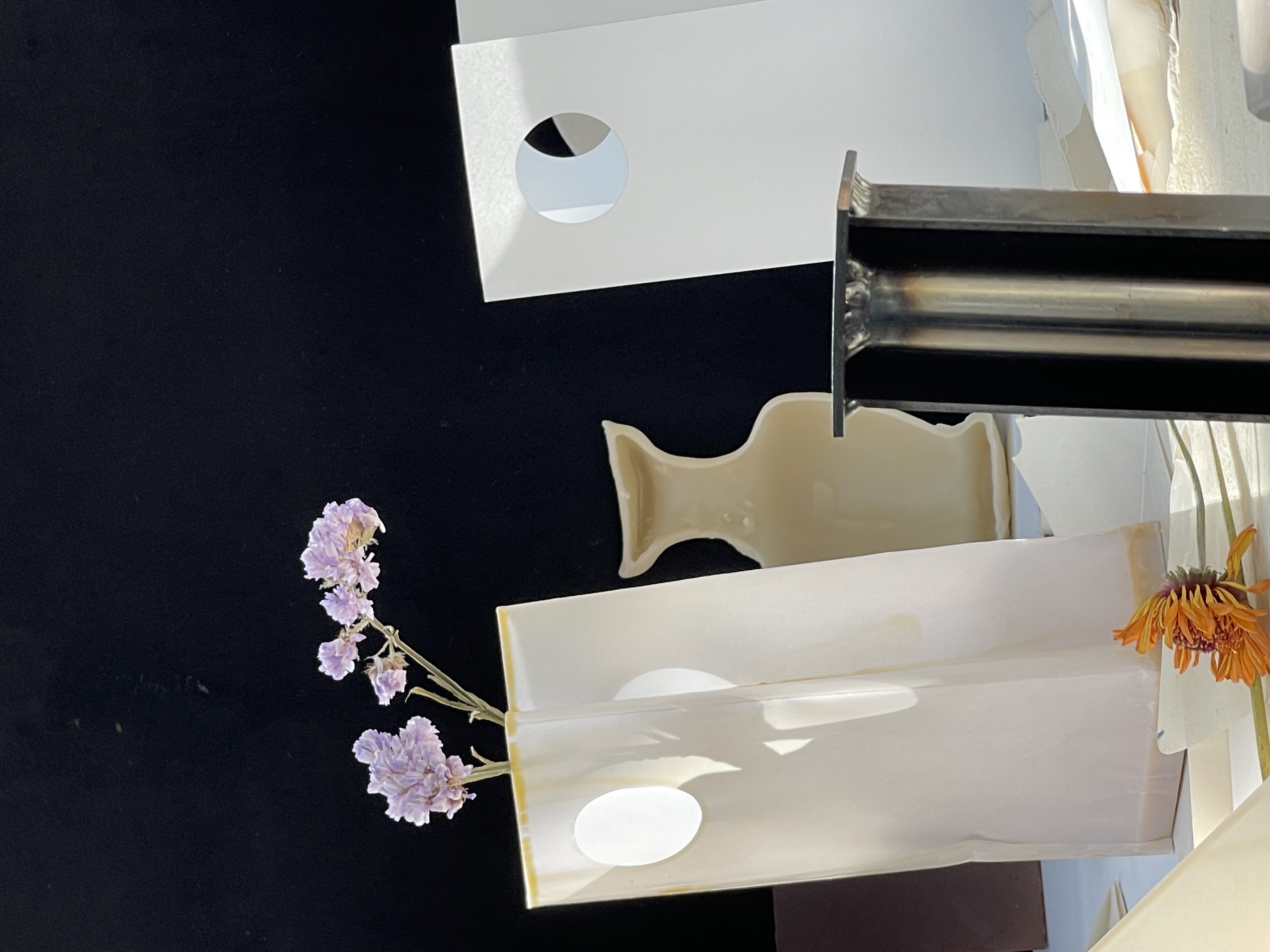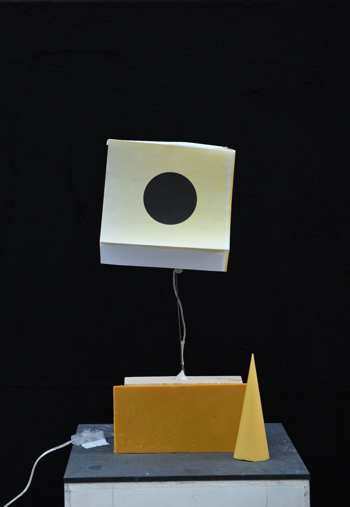 Une lampe en cire, un rideau en cire, une enveloppe en cire , une sonnette en cire, un vase en cire.